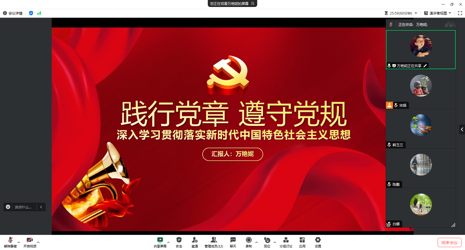 宣传委员万艳妮结合自身学习与思考,以《践行党章 遵守党规 深入开展学习贯彻习近平新时代中国特色社会主义思想主题教育》为题,围绕“加强教育引导,推动党员干部遵党章、守党规、做表率”“强化学思践悟,教育引导党员干部把习近平新时代中国特色社会主义思想落在实处、引向深入”二个方面,为全体党员讲授专题党课。