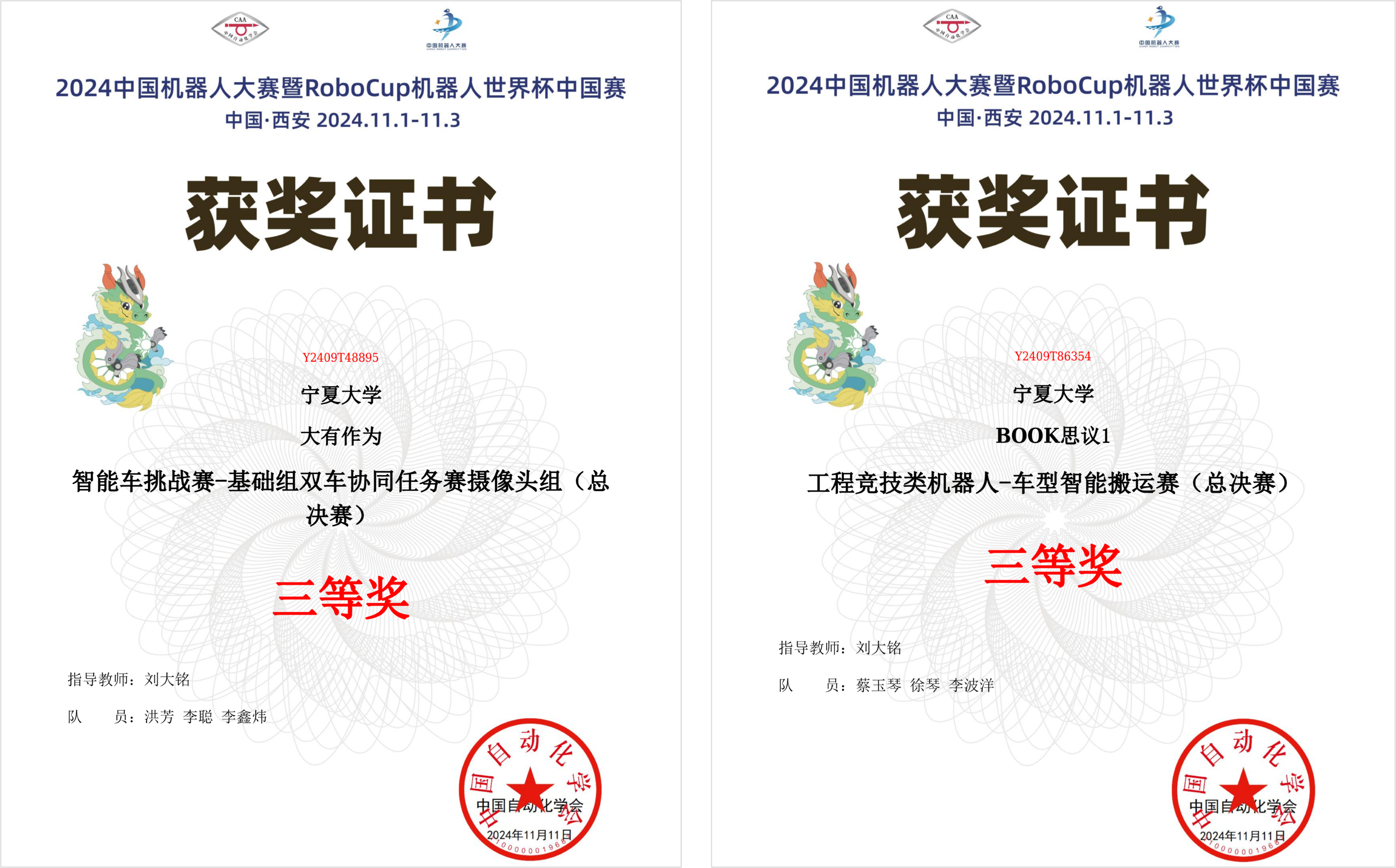 组织五支参赛队伍,在刘大铭教授指导下参加两个赛项的比赛,取得了智能车挑战赛-基础组双车协同任务赛摄像头组一等奖(冠军)一项、三等奖一项,工程竞技类机器人-车型智能搬运赛二等奖一项、三等奖一项的优异成绩,共有两支队伍进入全国总决赛。