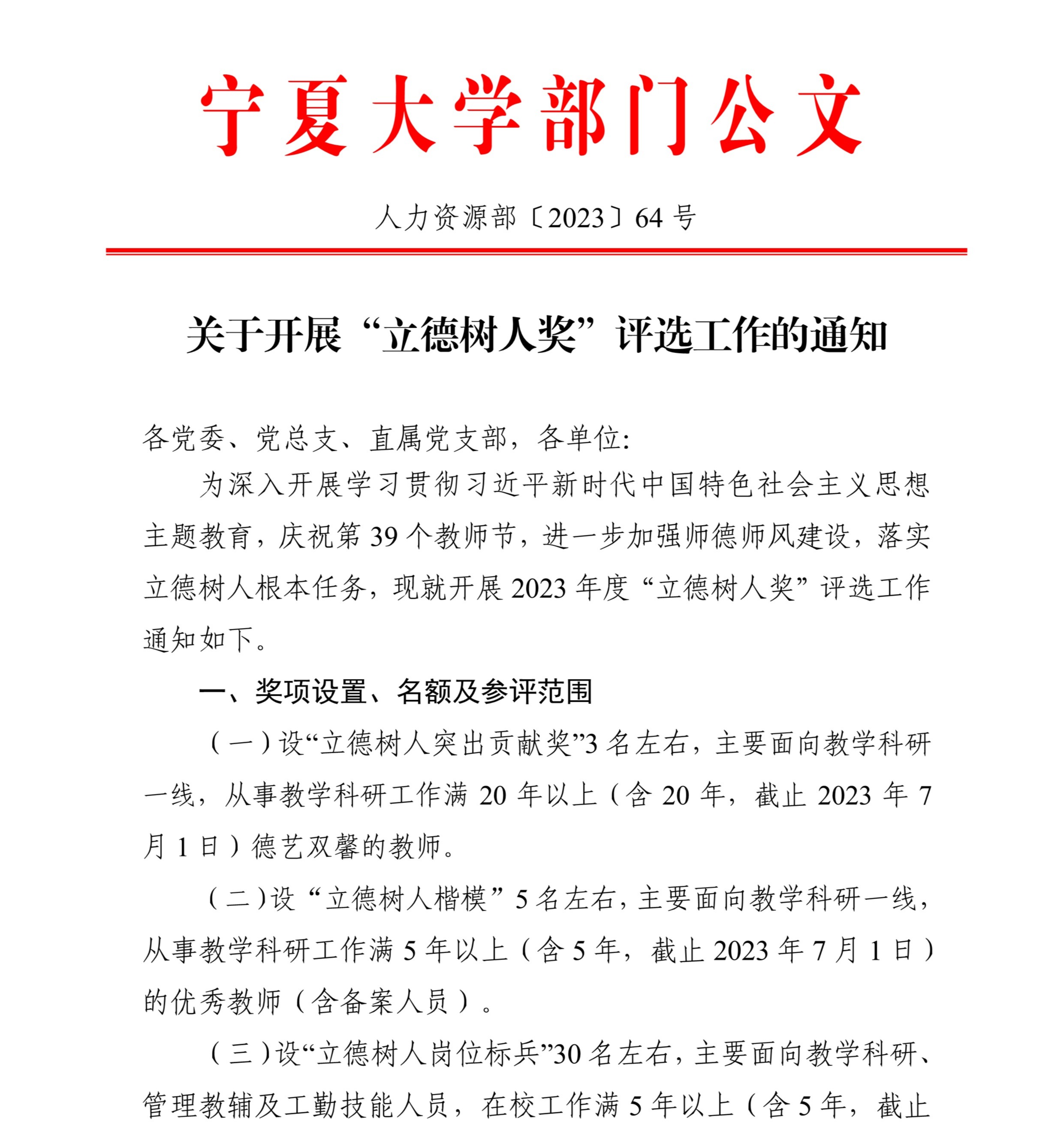 关于开展“立德树人奖”评选工作的通知