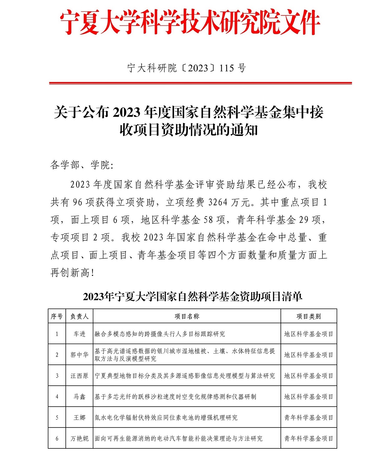 共有96项获得立项资助,国家自然科学基金在命中总量、重点项目、面上项目、青年基金项目等四个方面数量和质量方面上再创新高。